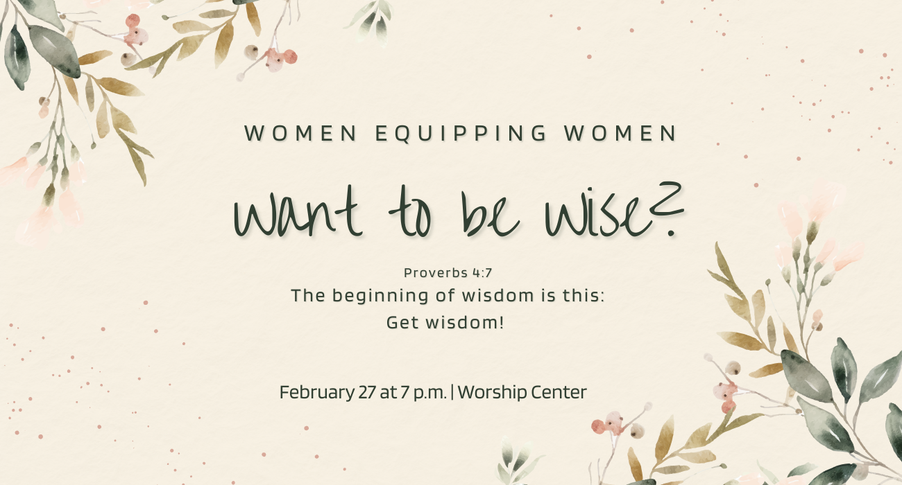 Please sign up below for our next Women Equipping Women. Becky Hintz will be speaking on "Want to be Wise?" from selected proverbs. We will enjoy food, fellowship, testimony, and the teaching of God's word. Starting at 7 p.m. in the Worship Center.